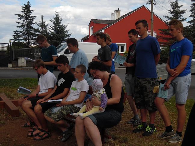 Ráno jsme vstávali na ranní chvály. Po snídani jsme zdobilly svíčky voskovými plátky. Moc se povedly. Potom jsme šly zvát obyvatele Hudcova na zítřejší mši svatou, po níž se má na místě bývalé kapličky stavět kříž.